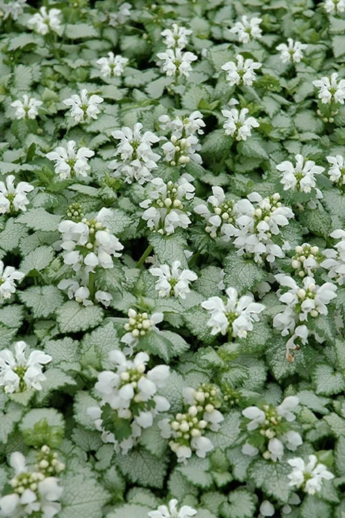 A perfect and very hardy perennial groundcover perfect for brightening up a shady to partly sunny spot, White Nancy Lamium is a vigorous grower that forms a carpet of stunning silvery-white leaves in garden beds or to cascade over the pots rim in container gardens. As an extra-added bonus, in spring to early summer clusters of cute, pure white flowers are perched just above and contrast beautifully with the foliage. A perfect selection for white theme gardens!